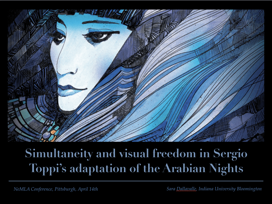 In the 80s, while Frank Miller and Alan Moore were exploring the comics medium to convey a new sense of temporality, the Italian cartoonist Sergio Toppi was similarly experimenting new reading and compositional strategies in his works, and particularly in his graphic novel Sharaz-De (1984), inspired by the Arabian Nights. This paper investigates Toppi’s approach to exotic, fairy-tale quality, and spatial-temporal indefiniteness of the original text. Toppi’s pages show a complex layout which only occasionally corresponds to a regular composition, and most often breaks the panel grid and builds a visual narrative where the shape of the images indicates the direction of the sequence. Unlike traditional Western reading strategies, which proceed from left to right and top to bottom, Toppi’s compositions convey a sense of simultaneity and visual freedom. Only after having perceived the page as a whole, the reader can find a possible spatial-temporal direction. Toppi achieves this effect by breaking up every image and then reassembling it with an almost cubistic approach. Even the white areas of the page are turned into something tangible and subjected to fragmentation. To study Toppi’s rendering of continuity and simultaneity, this paper will focus on selected pages which highlight both the author’s narrative style and his managing of the comics page. The paper will discuss the techniques Toppi employs to represent a mythical, suspended, and ahistorical world of wonder and magic. Analyzing Toppi’s mastering of the comics medium will allow us to appreciate the author’s contributions to the development of original ways to create visual storytelling.